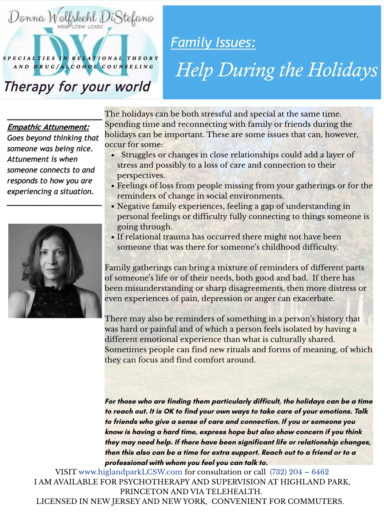 Relational psychotherapy focuses on empathy. My specific way of working is called Intersubjective Systems Theory or Phenomenological Contextual Psychoanalytic Theory. Long story short, our lives are not separate from others that are in it, nor are they from the world.