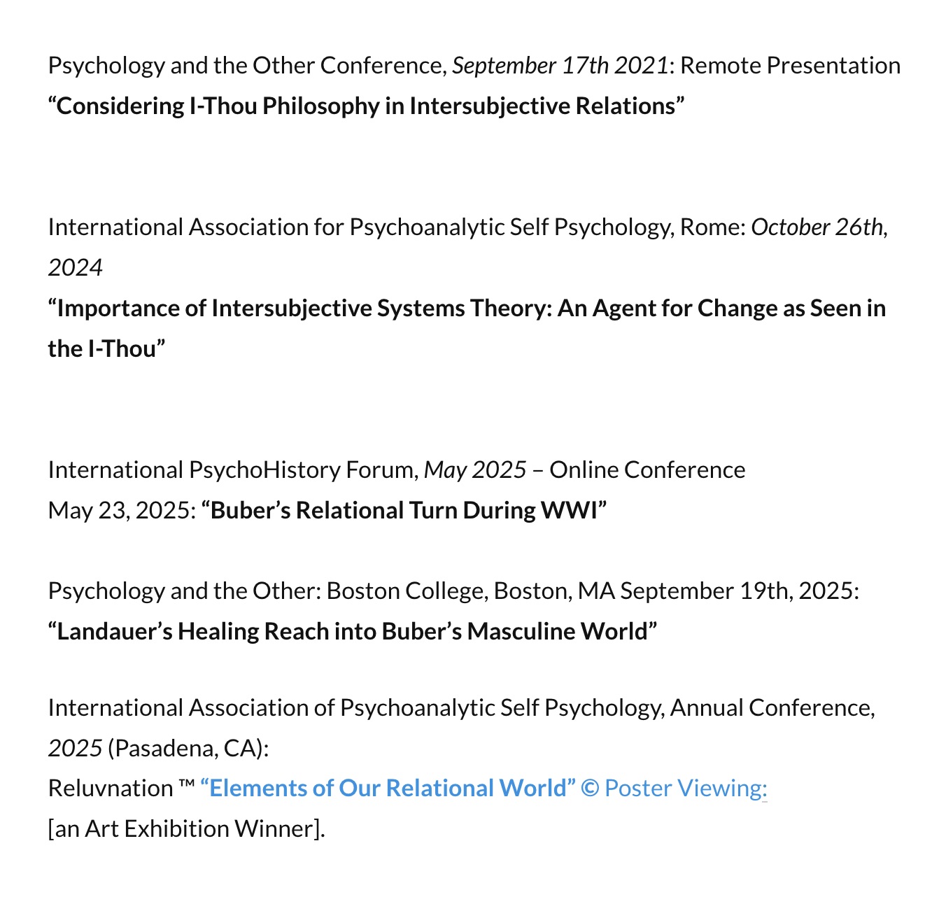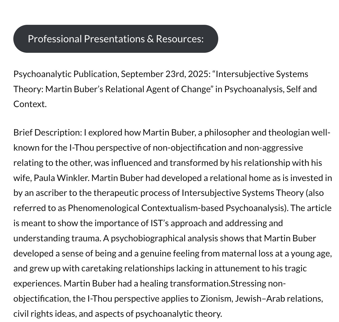 Donna’s life-long passion for psychoanalytic work began at her Rutgers University undergraduate program where she began learning about psychoanalysis and Intersubjective Systems Theory through classes and then an Independent Study with George Atwood, Ph.D. George Atwood’s Intersubjective ideas incorporating the phenomenological branch of philosophy for viewing the role and interaction with patients had a lasting impact. She remained committed to this particularly forward-moving and open-minded thought towards people and mental health.